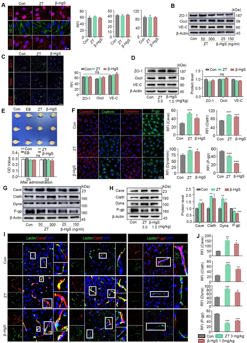 通過細(xì)胞蛋白組學(xué)分析結(jié)合體內(nèi)外蛋白驗(yàn)證,初步證實(shí)金屬制劑主要通過調(diào)節(jié)血腦屏障中的轉(zhuǎn)胞吞作用實(shí)現(xiàn)高效的跨腦遞藥功能。它能夠通過上調(diào)腦微血管中caveolin,clathrin,和 dynamin蛋白的表達(dá)促進(jìn)藥物向腦內(nèi)轉(zhuǎn)運(yùn),同時(shí)顯著降低 P-gp的表達(dá),以減少血腦屏障對(duì)藥物的外排作用,從而實(shí)現(xiàn)藥物在腦內(nèi)的高效富集。另外,值得關(guān)注的是,HgS金屬制劑并沒有引起血腦屏障緊密連接相關(guān)蛋白的表達(dá)降低,說明它對(duì)藥物的入腦作用并不是通過血腦屏障結(jié)構(gòu)的暫時(shí)性開放而實(shí)現(xiàn)的。