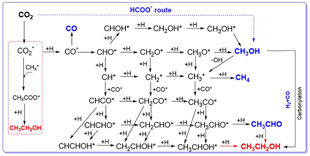 圖1.CO2加氫合成C2+OH的反應(yīng)網(wǎng)絡(luò)。