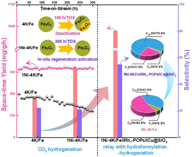 中國(guó)科學(xué)院蘭州化學(xué)物理研究所低碳催化與二氧化碳利用全國(guó)重點(diǎn)實(shí)驗(yàn)室可再生碳資源催化轉(zhuǎn)化組在前期Ni催化CO2加氫合成C2+OH(Angew. Chem. Int. Ed.,2023,DOI: https://doi.org/10.1002/anie.202311335.)和多相催化烯烴氫甲?;铣扇?/span>J. Catal. 2025,DOI: 10.1016/j.jcat.2025.116095;J. Org. Chem,2023,DOI:?10.1021/acs.joc.2c02105等)的研究基礎(chǔ)上,研究人員一方面構(gòu)建了Ni-K共修飾的Fe基催化劑(1Ni-4K/Fe),將CO2加氫生成C2+OH的時(shí)空收率(STY)提高到317.0 mg/g/h,并且能在300h內(nèi)穩(wěn)定運(yùn)行;另一方面利用接力催化思想,構(gòu)建了“CO2加氫-烯烴氫甲?;?醛氫化”(1Ni-4K/Fe||Rh1/POPs||Cu@SiO2)的三串聯(lián)體系,將產(chǎn)物中烯烴進(jìn)一步轉(zhuǎn)化為醇,實(shí)現(xiàn)C2+OH的時(shí)空收率達(dá)到980.5 mg/g/h,選擇性可達(dá)55.0%,而且由于氫甲?;脑鎏甲饔?,C2+OH中C3+OH的占比可達(dá)75.6%,顯著提升碳的利用率。
