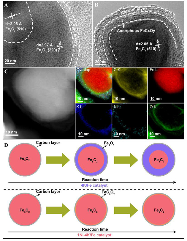 圖3.反應(yīng)后4K/Fe(A)和4K-1Ni/Fe(B)催化劑的HRTEM結(jié)果;(C)反應(yīng)后4K-1Ni/Fe催化劑EELS元素分布;(D)4K/Fe與4K-1Ni/Fe催化劑的結(jié)構(gòu)演變。