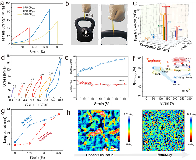 最后,研究人員通過機(jī)械性能測試證明,利用動態(tài)硬域精準(zhǔn)控制微相分離,成功實(shí)現(xiàn)了聚氨酯彈性體在力學(xué)性能上的調(diào)控,突破了長期以來高強(qiáng)度和高彈性無法兼容的瓶頸。調(diào)控優(yōu)化后的聚氨酯彈性體斷裂強(qiáng)度超過80MPa以上,該拉伸強(qiáng)度超過了目前已報道的大多數(shù)人工合成彈性體。此外,該優(yōu)化的聚氨酯彈性體在短程應(yīng)變下表現(xiàn)出超過90%的回彈效率,且在長程應(yīng)變下超過88%,該回彈效率也超過了目前所報道的大多人工合成彈性體,在短程變形時甚至可與生物彈性蛋白相媲美。