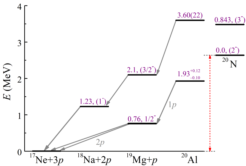 進(jìn)一步的研究表明,鋁-20基態(tài)通過級(jí)聯(lián)的質(zhì)子—雙質(zhì)子發(fā)射的兩步過程進(jìn)行衰變。作為中間態(tài)的鎂-19基態(tài)具有雙質(zhì)子放射性,它通過同時(shí)發(fā)射兩個(gè)質(zhì)子衰變?yōu)槟?/span>-17。鋁-20是實(shí)驗(yàn)上發(fā)現(xiàn)的首例具有“子核”雙質(zhì)子放射性的三質(zhì)子發(fā)射核。