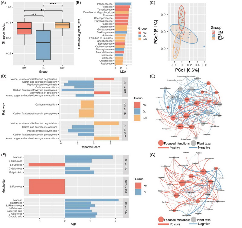 中國(guó)科學(xué)院西北高原生物研究所動(dòng)物生態(tài)與資源保護(hù)研究團(tuán)隊(duì)在青藏高原青海湖流域、昆侖山及三江源三大典型區(qū)域采集了巖羊的新鮮糞便樣本,利用trnL植物DNA條形碼技術(shù)、宏基因組測(cè)序技術(shù)和非靶向代謝組學(xué)技術(shù),構(gòu)建了巖羊食性 - 微生物 - 代謝物多組學(xué)關(guān)聯(lián)分析框架,深入解析了巖羊在青藏高原不同區(qū)域的食性差異、腸道微生物組成與功能特征及其代謝產(chǎn)物差異,探索了食性結(jié)構(gòu)與微生物共生系統(tǒng)的協(xié)同變異規(guī)律,揭示了宿主 - 微生物共生系統(tǒng)在區(qū)域適應(yīng)中的協(xié)同進(jìn)化模式。
