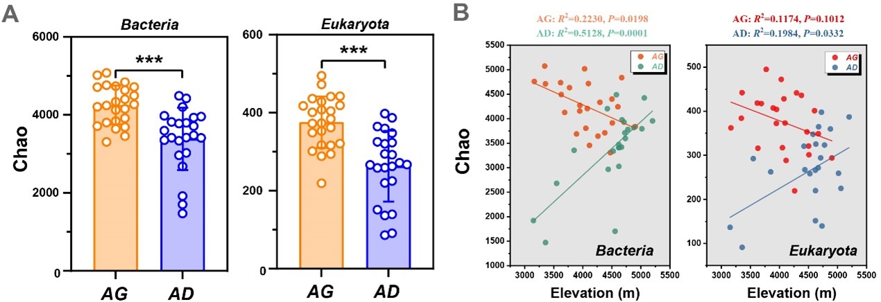 研究發(fā)現(xiàn),兩類生態(tài)系統(tǒng)中,細(xì)菌和真核生物α-多樣性呈現(xiàn)相反的海拔格局。高寒草地隨海拔升高顯著線性下降,而高寒荒漠則顯著線性上升。