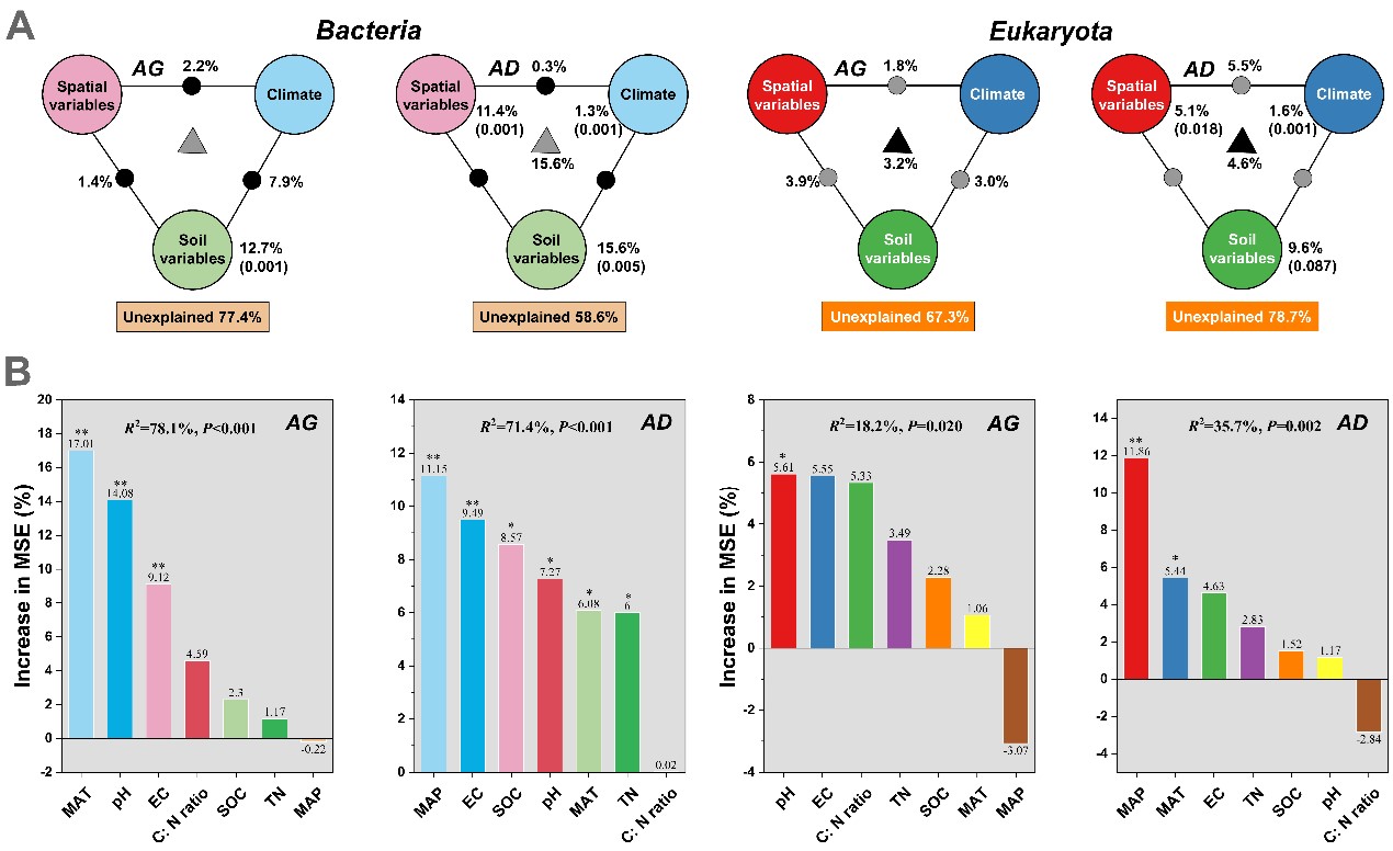 高寒草地與高寒荒漠細(xì)菌和真核生物群落組成的地理距離、氣候因子和土壤變量及其相互作用的變異分配分析