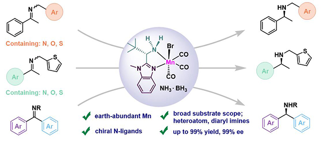 近日,中國科學院蘭州化學物理研究所低碳催化與二氧化碳利用全國重點實驗室仿生催化與低碳化學組,在前期發(fā)展的錳催化不對稱轉(zhuǎn)移氫化反應的基礎上 (ACS Catal.,2021,11,8033-8041;J. Catal.,2022,413,487-497;J. Catal.,2024,438,115680),在含雜原子(N,O,S)亞胺和雙芳基亞胺的不對稱轉(zhuǎn)移氫化反應取得了新進展。