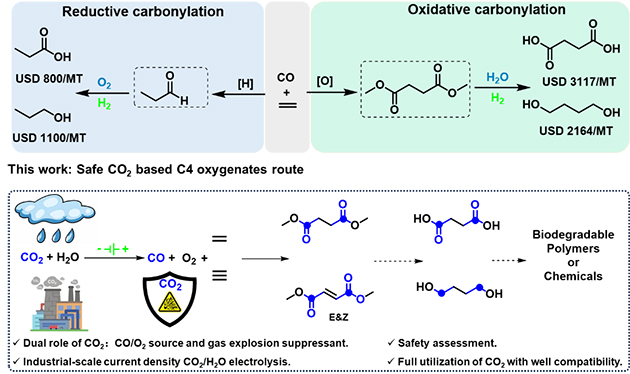 在此前氧化羰基化研究的基礎(chǔ)之上(Science,2024,386: 776-782;Angew Chem Int Ed,2020,59: 2080-2084;ACS Catal.,2023,13: 735-743;ChemSusChem,2022,15: e202102400;分子催化,2020,34,182–192;2024,38,297–308),研究人員通過一種CO2全利用策略,將CO2-H2O共電解生成的CO/O2作為原料,與乙烯/乙炔的氧化雙羰基化合成CO2基C4雙酯類化合物,如丁二酸二甲酯、富馬酸二甲酯和馬來酸二甲酯等,這類化合物在可降解聚合物(聚丁二酸二丁酯)、增塑劑、溶劑、表面活性劑、有機(jī)合成中間體等多個(gè)領(lǐng)域內(nèi)有著廣泛的用途。與傳統(tǒng)的烯/炔烴羰基化相比較,烯/炔烴氧化羰基化能同時(shí)插入兩個(gè)羰基,生成更有價(jià)值的化學(xué)品。此外,尚未電解的CO2可作為氣體抑爆劑,可消除或降低乙烯/乙炔氧化雙羰基化反應(yīng)過程中潛在的爆炸風(fēng)險(xiǎn)。