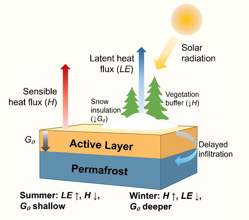 凍土區(qū)季節(jié)性能量通量與地下水文過(guò)程示意圖