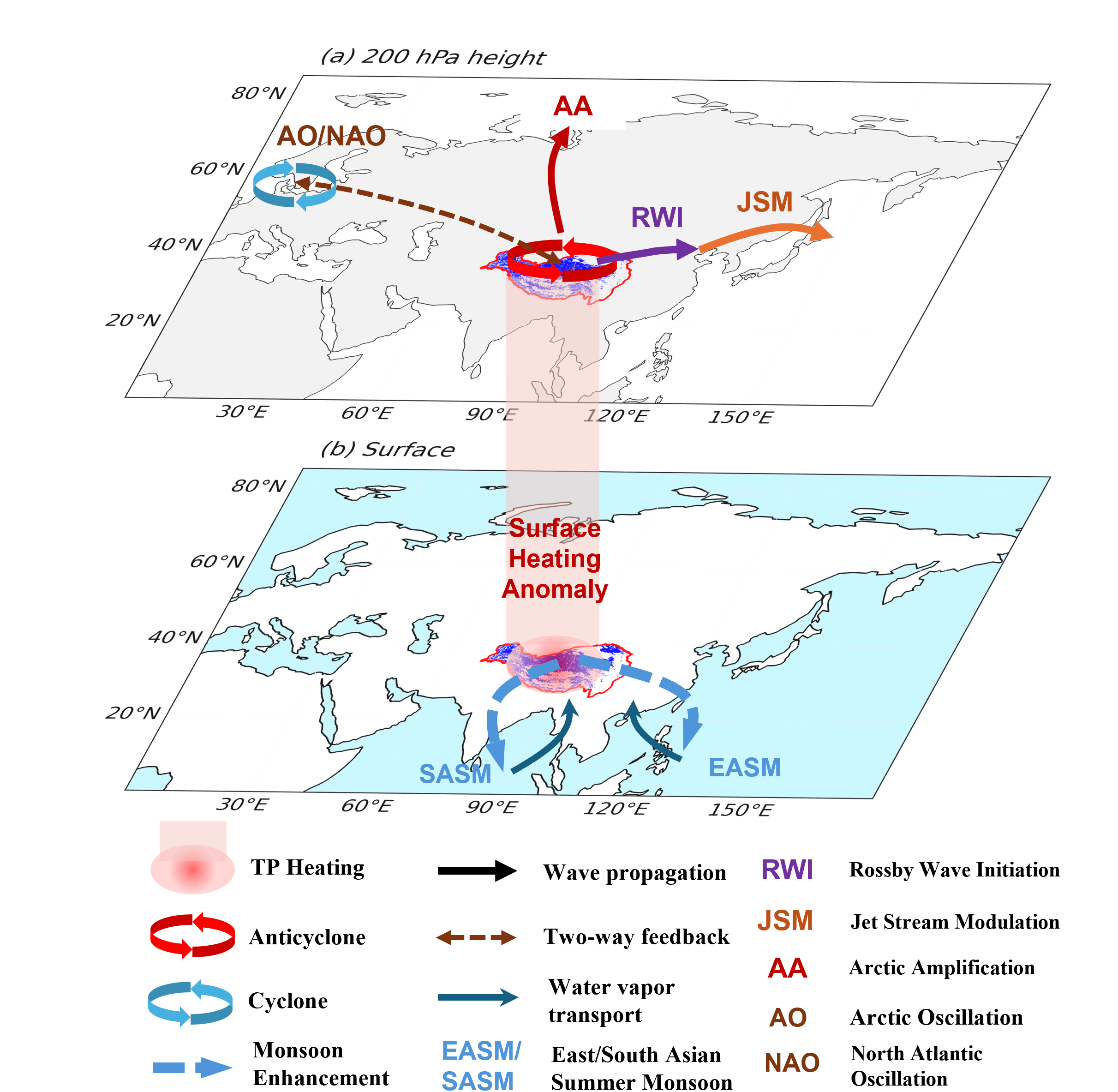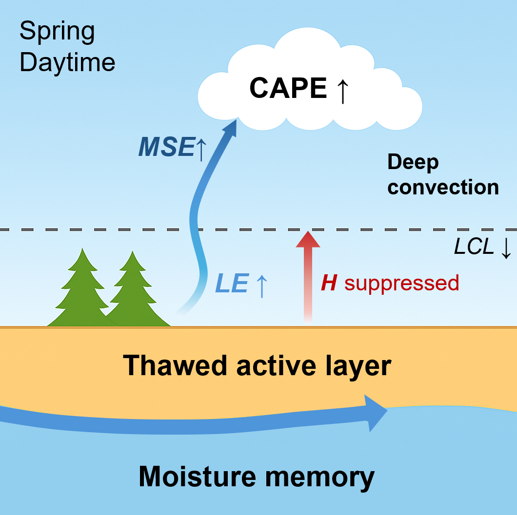 研究團(tuán)隊(duì)依托長(zhǎng)期野外觀測(cè)、遙感反演和過(guò)程模擬,完整描繪了“地表能量分配→邊界層演變→季風(fēng)與行星波響應(yīng)”的多尺度反饋鏈條。結(jié)果表明,多年凍土的“凍融記憶”,即凍結(jié)或融化狀態(tài)在季節(jié)間延續(xù)并影響后續(xù)熱量與水分過(guò)程,并對(duì)土壤熱物理特性及潛熱/顯熱分配造成影響,共同決定了能量釋放的節(jié)奏與路徑,進(jìn)而影響邊界層穩(wěn)定性、對(duì)流觸發(fā)和大氣遙相關(guān)結(jié)構(gòu)。