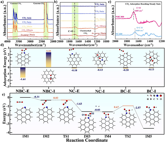 圖2.理論計(jì)算結(jié)合原位紅外揭示N-B位點(diǎn)活化轉(zhuǎn)化CO2新機(jī)制