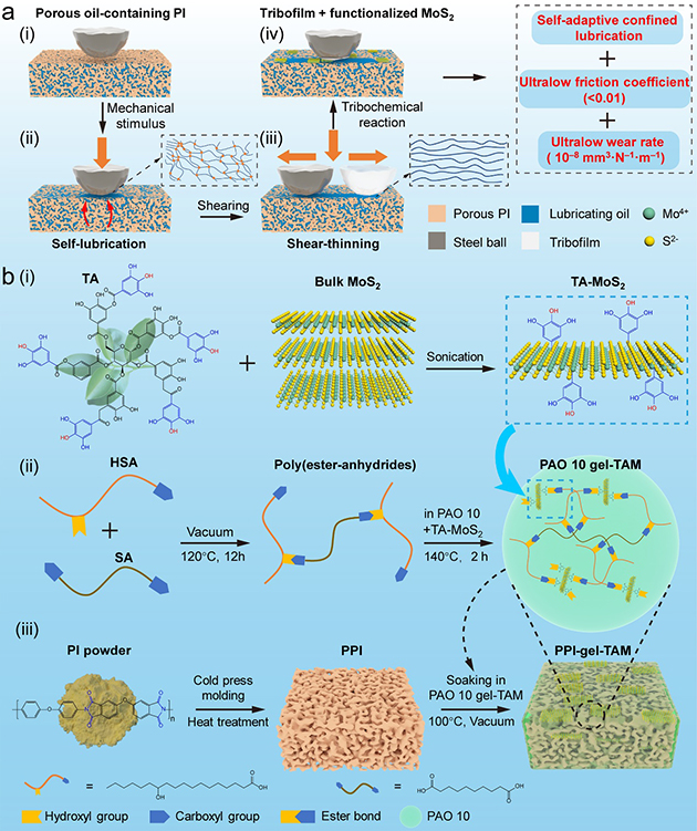 鋼/PPI界面宏觀超潤滑機理可歸因于四種機制的耦合作用,多孔結構的儲油/釋放、潤滑劑的剪切變稀特性、功能化的二硫化鉬與油分子之間的相互作用以及摩擦保護膜的形成(圖2)。