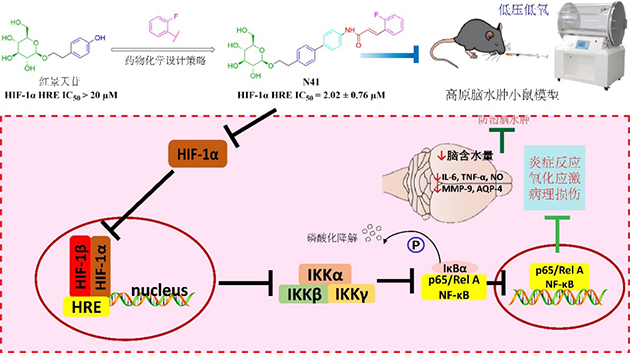 研究團隊聚焦高原腦水腫防治重大問題,以高原特色中草藥紅景天中的活性成分紅景天苷為結(jié)構(gòu)基礎(chǔ),基于骨架躍遷和分子雜合的藥物設(shè)計策略,通過引入鄰氟苯基HIF-1α抑制劑藥效團,對紅景天苷的糖苷鍵、連接鏈、芳環(huán)取代基等三個部分進行結(jié)構(gòu)修飾,設(shè)計并合成了多種紅景天苷衍生物開展構(gòu)效關(guān)系研究。通過雙熒光素酶報告基因、細胞毒、ELISA等實驗,篩選獲得強活性化合物N41,可顯著抑制HIF-1α HRE轉(zhuǎn)錄(IC50: 2.02 ± 0.76 μM),減少C8-D1A細胞炎癥因子IL-6和NO的表達以及ROS積累,減輕氧化損傷且無明顯細胞毒性。HACE小鼠模型研究發(fā)現(xiàn),N41可有效降低HACE模型小鼠腦含水量,改善缺氧導(dǎo)致的腦組織損傷,通過阻斷HIF-1α/IKKα/NF-κB信號通路,抑制下游TNF-α、IL-6等炎癥因子及MMP-9、AQP-4等血腦屏障通透性相關(guān)因子表達,緩解炎癥反應(yīng)和維持血腦屏障完整性,發(fā)揮高原腦水腫防治功效。相關(guān)研究成果發(fā)表在European Journal of Medicinal Chemistry(2025,297: 117982)上。