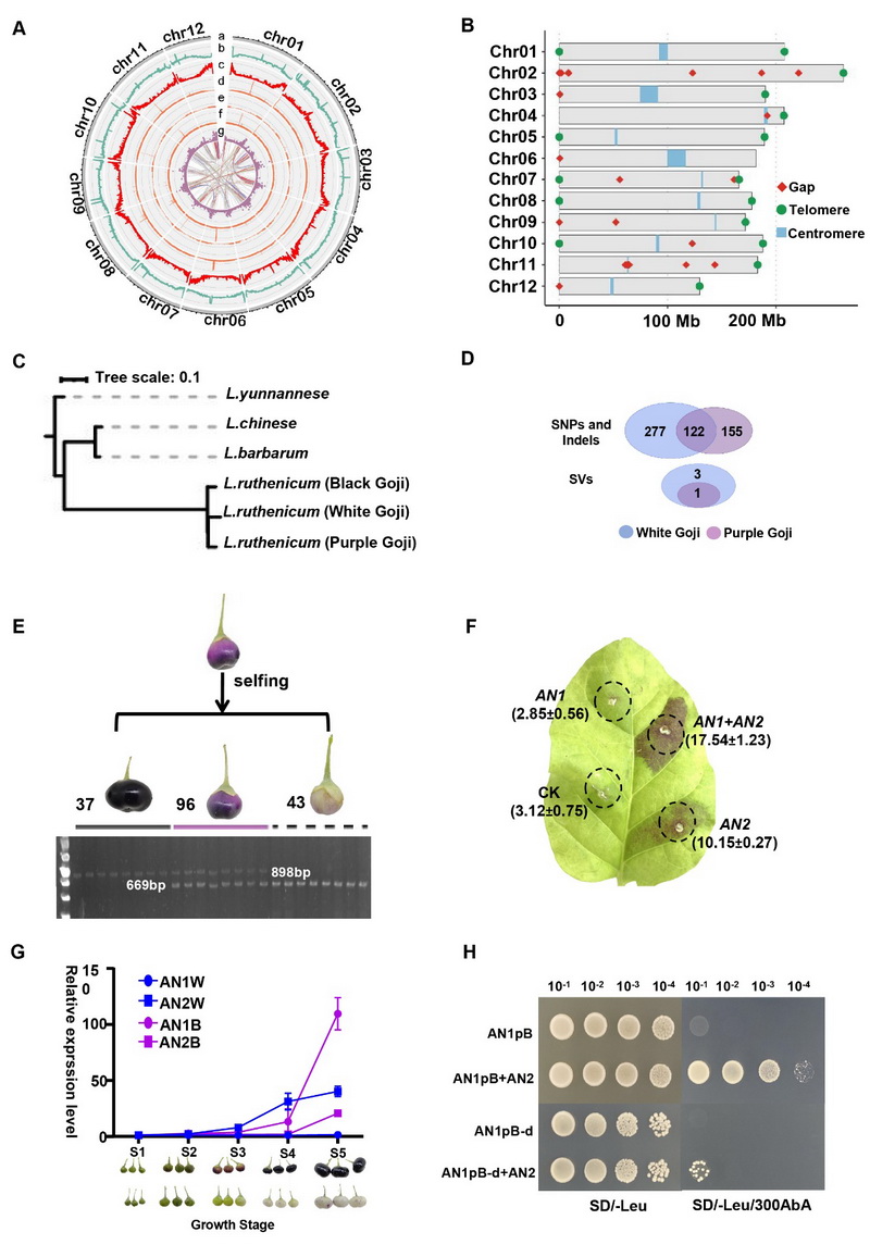 圖?黑果枸杞高質(zhì)量基因組及229 bp AN1 啟動(dòng)子缺失導(dǎo)致果色分化。(A) 染色體基因組特征分布。(B) 缺口、端粒和著絲粒位置。(C) 枸杞屬系統(tǒng)發(fā)育樹。(D) 白、紫與黑果枸杞間花青素相關(guān)變異。(E) 紫果后代果色分離及基因型鑒定。(F) AN1/AN2 在煙草瞬時(shí)表達(dá)。(G) 白果與黑果 AN1/AN2 表達(dá)動(dòng)態(tài)。(H) Y1H 驗(yàn)證 AN2 與 AN1 啟動(dòng)子的結(jié)合。
