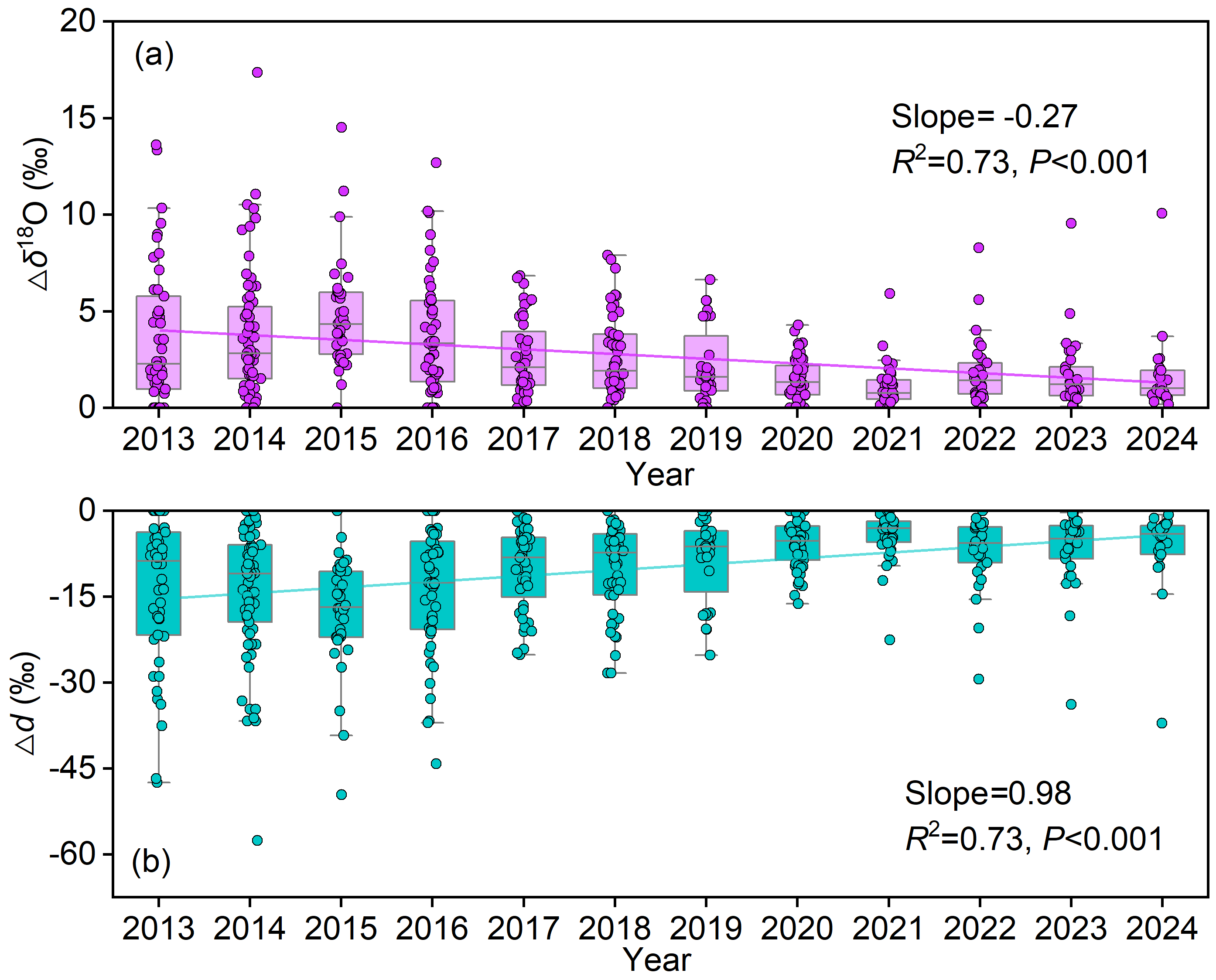 研究表明,云下蒸發(fā)導致降水穩(wěn)定同位素組成顯著偏正、氘盈余顯著降低,且該影響存在明顯季節(jié)與天氣差異,干旱季節(jié)及低濕度條件下尤為突出,最高可使降水δ1?O偏正20%以上,遠超此前預期。