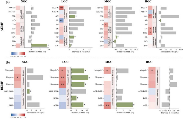圖1?不同礫石化水平下AEMF與BEMF的相關性及主要驅(qū)動因子重要性分析