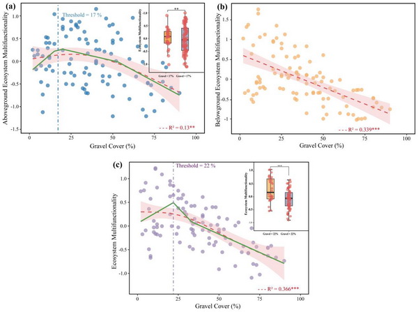 研究發(fā)現(xiàn),隨著礫石覆蓋度的增加,草地植物物種豐富度、功能群組成及生物量顯著下降,尤其是地下生物量的減少最為明顯;土壤含水量、孔隙度及養(yǎng)分含量顯著降低,而容重顯著升高,導致生態(tài)系統(tǒng)整體功能衰退。礫石化不僅直接抑制植物生長,還通過削弱土壤養(yǎng)分供給間接降低生態(tài)系統(tǒng)多功能性。隨機森林與結(jié)構方程模型分析進一步揭示,土壤養(yǎng)分和植物多樣性是決定生態(tài)系統(tǒng)多功能性的關鍵調(diào)控因子。隨礫石化程度加劇,地上功能指數(shù)(AEMF)和地下功能指數(shù)(BEMF)均顯著下降,后者的響應更為敏感,當?shù)[石覆蓋度超過22%時,生態(tài)系統(tǒng)多功能性(EMF)出現(xiàn)明顯突變性下降,表明該閾值可作為高寒草地退化的早期預警指標。研究指出,高寒草地礫石化退化過程會破壞植物-土壤耦合關系,導致生態(tài)功能的同步退化。