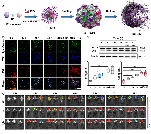 團隊進一步探索溶酶體功能變化與Aβ蛋白相分離之間的關系。通過ATRP合成pH響應骨架,將AIE染料四苯乙烯(TPE)共價接枝,并自組裝包載近紅外ACQ染料吲哚菁綠(ICG),形成AIE/ACQ協同的比率成像納米結構探針(PTI),實現AD自噬溶酶體酸化缺陷及其驅動的相分離過程的可視化“全流程”監(jiān)測。