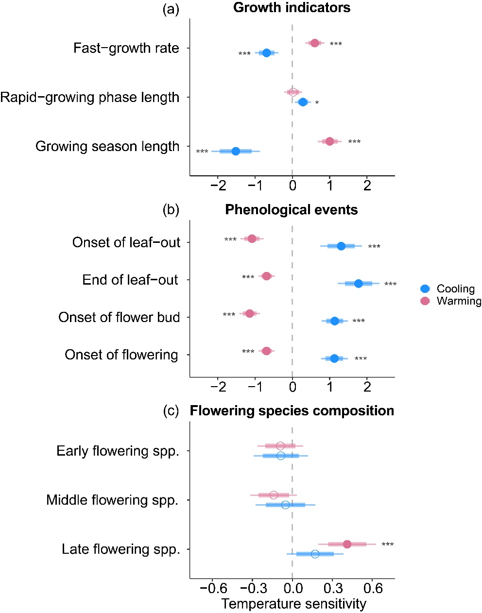 圖3 增溫和降溫下生長指標(biāo)、物候事件及開花物種組成的溫度敏感性
