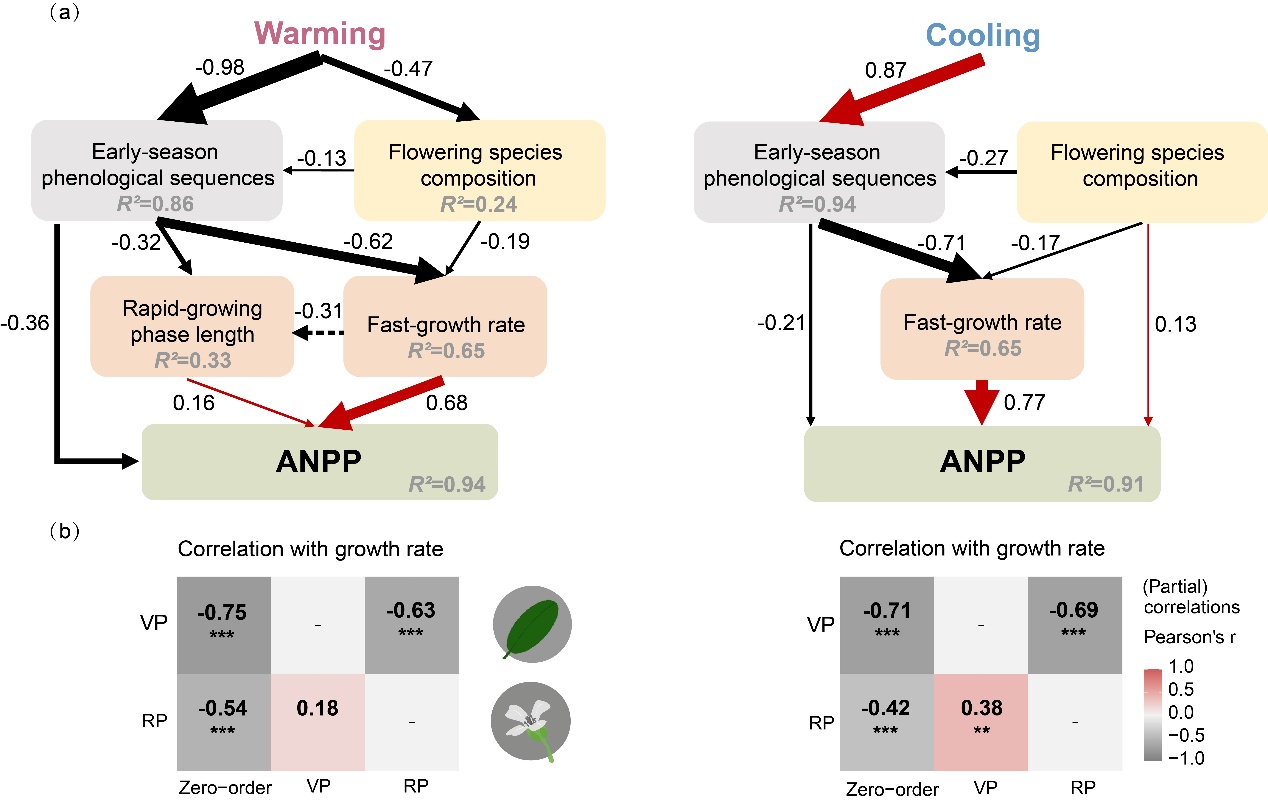 研究結(jié)果表明,在15年增溫處理下,ANPP顯著增加,而在降溫處理下降低。值得注意的是,增溫對ANPP的促進效應(yīng)隨時間推移逐漸增強,而降溫的抑制效應(yīng)則未表現(xiàn)出顯著的時間依賴性。重要的是,生長季早期物候影響了ANPP對增溫和降溫的響應(yīng)。關(guān)鍵發(fā)現(xiàn)在于,生長季早期的物候變化在調(diào)節(jié)ANPP對溫度變化的響應(yīng)中發(fā)揮重要作用。具體而言,增溫條件下ANPP的增加與植物返青期提前及生長速率加快密切相關(guān);而在降溫條件下,葉片與開花物候?qū)χ参锷L表現(xiàn)出解耦的級聯(lián)效應(yīng):返青期提前反而抑制了植物后續(xù)生長,而開花期推遲則部分抵消了前期的不利影響。