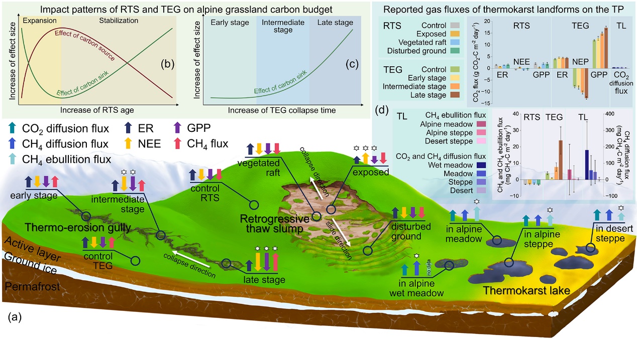 中國(guó)科學(xué)院西北生態(tài)環(huán)境資源研究院冰凍圈科學(xué)與凍土工程全國(guó)重點(diǎn)實(shí)驗(yàn)室研究團(tuán)隊(duì)聯(lián)合蘭州大學(xué)、丹麥哥本哈根大學(xué)以及中國(guó)科學(xué)院植物研究所,于2024和2025年在青藏高原腹地開展系統(tǒng)性溫室氣體通量觀測(cè),量化了熱融滑塌所導(dǎo)致的通量變化以及研究區(qū)域的碳收支平衡,為評(píng)估氣候變化背景下青藏高原多年凍土碳反饋提供了關(guān)鍵證據(jù)。