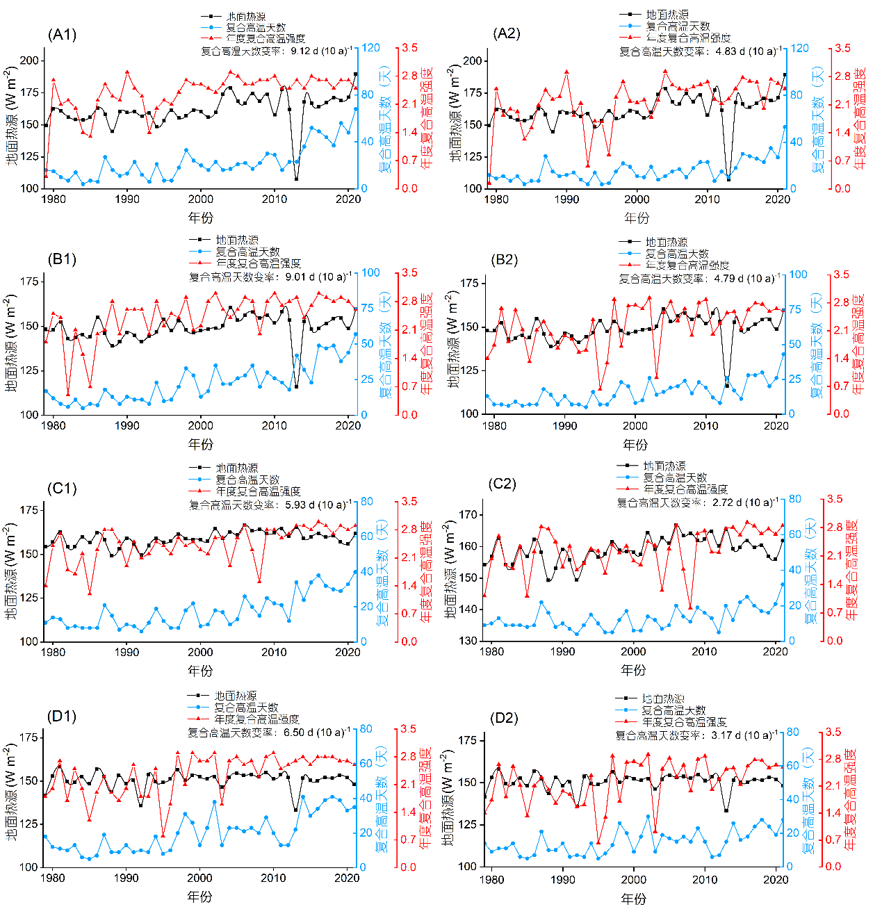 1979–2021年4個(gè)城市群地面熱源、復(fù)合高溫天數(shù)和年度復(fù)合高溫強(qiáng)度的年際變化。(A) 珠江三角洲;(B) 長(zhǎng)江三角洲;(C) 成渝地區(qū);(D) 京津冀地區(qū)。1:基準(zhǔn)期1981–2010年;2:基準(zhǔn)期1991–2020年