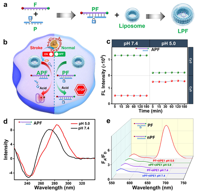 研究團(tuán)隊(duì)以酸性pH響應(yīng)的i-motif結(jié)構(gòu)F鏈為傳感核心,通過與含有APE1酶特異性識別位點(diǎn)的互補(bǔ)“阻斷鏈”P鏈雜交,構(gòu)建可激活型pH探針(PF)。進(jìn)一步經(jīng)脂質(zhì)體包封形成LPF,顯著提升了其血腦屏障穿透能力及在體穩(wěn)定性。該傳感器僅在APE1高表達(dá)的缺血病灶區(qū)被激活后,才能實(shí)現(xiàn)對缺血腦區(qū)pH的高對比度、高特異性比率型成像(圖1)。在腦卒中動物模型中,LPF成功實(shí)現(xiàn)了對腦內(nèi)pH梯度的動態(tài)、空間分辨監(jiān)測,清晰勾勒出缺血區(qū)域,展現(xiàn)出優(yōu)異的血腦屏障穿透能力與成像信噪比(圖2)。以上研究為腦卒中早期檢測、機(jī)制研究和新藥研究提供了新策略。