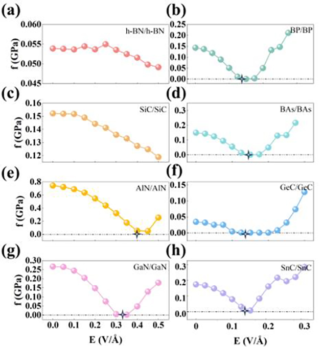 圖3. 8種類h-BN材料的摩擦力f與外電場(chǎng)E的關(guān)系。