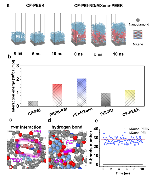 圖4.CF-PEEK改性復合材料界面結構的分子模擬結果。(a)CF/PEEK復合材料和CF-PEI-ND/MXene/PEEK復合材料的模擬模型,(b)PEI與PEEK之間的π-π相互作用能和(c)PEI與PEEK之間的π-π相互作用,以及(d)PEI-MXene之間的氫鍵作用