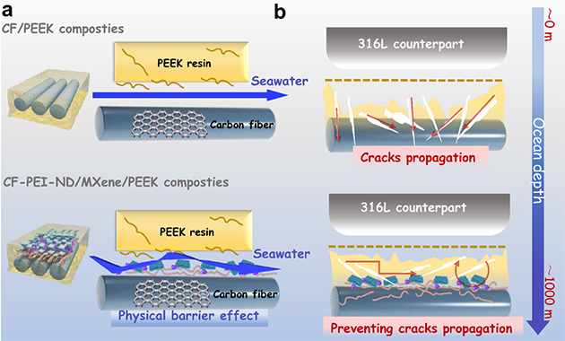 圖5.模擬深海環(huán)境下CF/PEEK復合材料增強潤滑機制及強韌界面機制示意圖