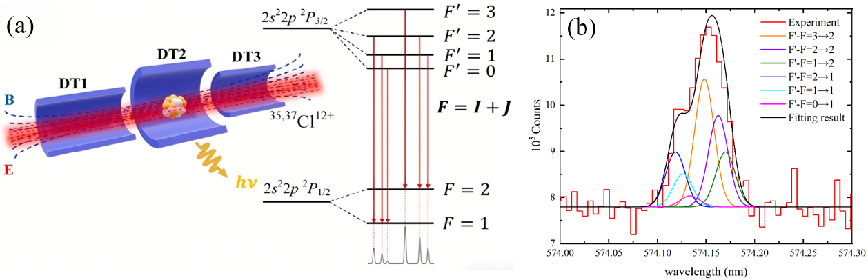 由于高電荷態(tài)離子制備條件苛刻、多電子體系能級(jí)結(jié)構(gòu)復(fù)雜,對(duì)其開(kāi)展高精度實(shí)驗(yàn)測(cè)量長(zhǎng)期面臨較大的技術(shù)挑戰(zhàn)。研究團(tuán)隊(duì)依托高溫超導(dǎo)電子束離子阱(EBIT)實(shí)驗(yàn)平臺(tái),首次成功觀測(cè)到類硼氯離子(Cl12+) 中2P1/2和 2P3/2能級(jí)的超精細(xì)分裂結(jié)構(gòu),并通過(guò)高分辨譜線擬合獲得了相應(yīng)的超精細(xì)結(jié)構(gòu)常數(shù),利用第一性原理理論計(jì)算,成功提取該離子原子核的磁偶極和電四極超精細(xì)結(jié)構(gòu)常數(shù)。該工作為中等原子序數(shù)高電荷態(tài)離子超精細(xì)結(jié)構(gòu)的理論研究提供了重要實(shí)驗(yàn)基準(zhǔn)。