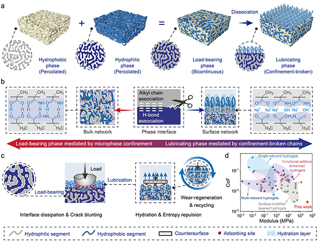 在人體關(guān)節(jié)中,軟骨依托多尺度膠原網(wǎng)絡(luò)、多相組分及其界面的協(xié)同作用,構(gòu)建出兼具高承載與超低摩擦的天然潤滑系統(tǒng)?;谶@一特性,水凝膠作為有潛力的人工軟骨替代材料備受關(guān)注。然而,傳統(tǒng)潤滑水凝膠往往因結(jié)構(gòu)均一性而陷入兩難境地,提高整體網(wǎng)絡(luò)致密度雖能增強力學(xué)性能,卻會削弱表面水合與潤滑能力;單純追求低摩擦,又會使材料在高載荷下迅速變形、蠕變甚至失效。這種長期存在的性能權(quán)衡,嚴(yán)重制約了水凝膠在高載荷、長壽命潤滑場景中的實際應(yīng)用。