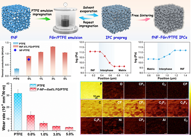 針對泡沫金屬與聚四氟乙烯異質(zhì)界面結(jié)合弱的問題,研究人員采用氟硅烷偶聯(lián)劑對泡沫鎳三維連續(xù)界面進行液相氟化改性,同時在基體中引入少量氟化石墨。結(jié)果表明,界面-基體“雙氟化”的設(shè)計有效增強了泡沫鎳與聚四氟乙烯之間的界面結(jié)合,從而抑制外力拉伸時的變形與裂紋擴展;少量氟化石墨的引入增強了PTFE連續(xù)相的硬度、模量,使得雙連續(xù)相復(fù)合材料的導(dǎo)熱系數(shù)提升至1.3 W/(m·K)。得益于由聚四氟乙烯、鎳磨屑與氟化石墨在金屬配副表面形成的復(fù)合摩擦轉(zhuǎn)移膜,進一步改善了復(fù)合物的摩擦學(xué)性能,磨損率下降90.7%。相關(guān)研究結(jié)果發(fā)表在Composites Part B: Engineering(2025: 112816)上。