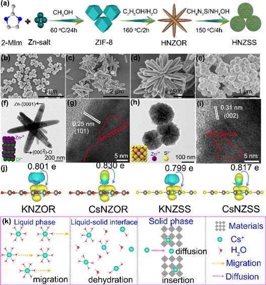 基于上述策略,將十二面體ZIF-8定向轉(zhuǎn)化為無碳氮摻雜氧化鋅棒(HNZOR),并進(jìn)一步將其轉(zhuǎn)化為硫化鋅球(HNZSS)。與傳統(tǒng)煅燒方法相比,該方法有效抑制了金屬團(tuán)聚,充分暴露活性位點,并形成了具有高表面積的非晶區(qū)域(HNZOR為203.9 m2/g,HNZSS為61.7 m2/g)。這些特性協(xié)同增強(qiáng)了傳質(zhì)能力,并在吸附劑骨架中形成強(qiáng)結(jié)合力,從而實現(xiàn)了優(yōu)異的吸附性能。K?活化后的吸附劑(KNZOR和KZNSS)展現(xiàn)出快速吸附動力學(xué)和高吸附容量(分別為275 mg/g和302 mg/g),克服了競爭離子干擾,在復(fù)雜環(huán)境中對Cs?具有優(yōu)異的選擇性。在實際水樣中,它們表現(xiàn)出卓越的吸附效率,KNZOR和KZNSS的分配系數(shù)(Kd)分別達(dá)到2061.85 mL/g和2578.31 mL/g。在實際柱操作中,KNZOR和KZNSS在連續(xù)流條件下可實現(xiàn)近定量(約99%)的Cs?回收。研究結(jié)果以“In-situ sequential topotactic transformation of ZIF-8 to N-doped Zn-oxide/ sulfide with defect engineering for efficient radiocesium capture” 為題發(fā)表于Chem. Eng. J.(一區(qū)TOP)。