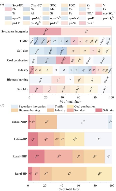 針對(duì)這一問(wèn)題,中國(guó)科學(xué)院青海鹽湖研究所相關(guān)研究團(tuán)隊(duì)于2020年1月至2023年3月在柴達(dá)木盆地南部6個(gè)監(jiān)測(cè)點(diǎn)持續(xù)開(kāi)展月度大氣降塵采樣。結(jié)果表明,柴達(dá)木盆地南部大氣降塵的化學(xué)組成呈現(xiàn)明顯鹽塵影響特征,鄉(xiāng)村地區(qū)鹽湖來(lái)源離子貢獻(xiàn)較高,表明鹽湖裸露地表和周邊鹽漬化土壤是區(qū)域重要自然塵源;碳質(zhì)組分分析進(jìn)一步發(fā)現(xiàn),供暖期有機(jī)碳、元素碳及char/soot比值明顯升高,反映出固體燃料燃燒排放增強(qiáng)。源解析結(jié)果顯示,非供暖期降塵主要受交通排放和土壤揚(yáng)塵影響,供暖期則主要受煤炭和生物質(zhì)燃燒影響;其中,鹽塵對(duì)鄉(xiāng)村地區(qū)非供暖期降塵貢獻(xiàn)較為顯著。總體來(lái)看,供暖活動(dòng)不僅增強(qiáng)了碳質(zhì)組分排放,還可能通過(guò)改變局地氣象條件并疊加道路揚(yáng)塵、除冰鹽使用等人類活動(dòng),與鹽湖和土壤揚(yáng)塵共同影響區(qū)域降塵組成。