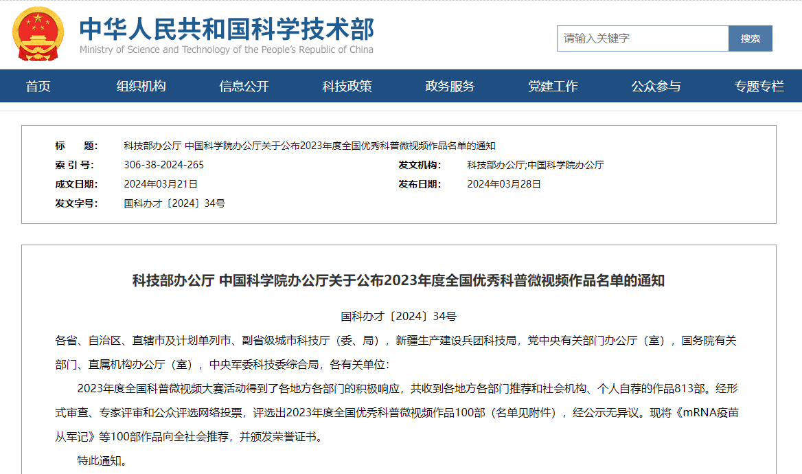 據(jù)悉,2023年度全國科普微視頻大賽共收到各地方各部門推薦和社會機構、個人自薦的作品813部,經(jīng)形式審查、專家評審和公眾評選網(wǎng)絡投票,評選出2023年度全國優(yōu)秀科普微視頻作品100部。