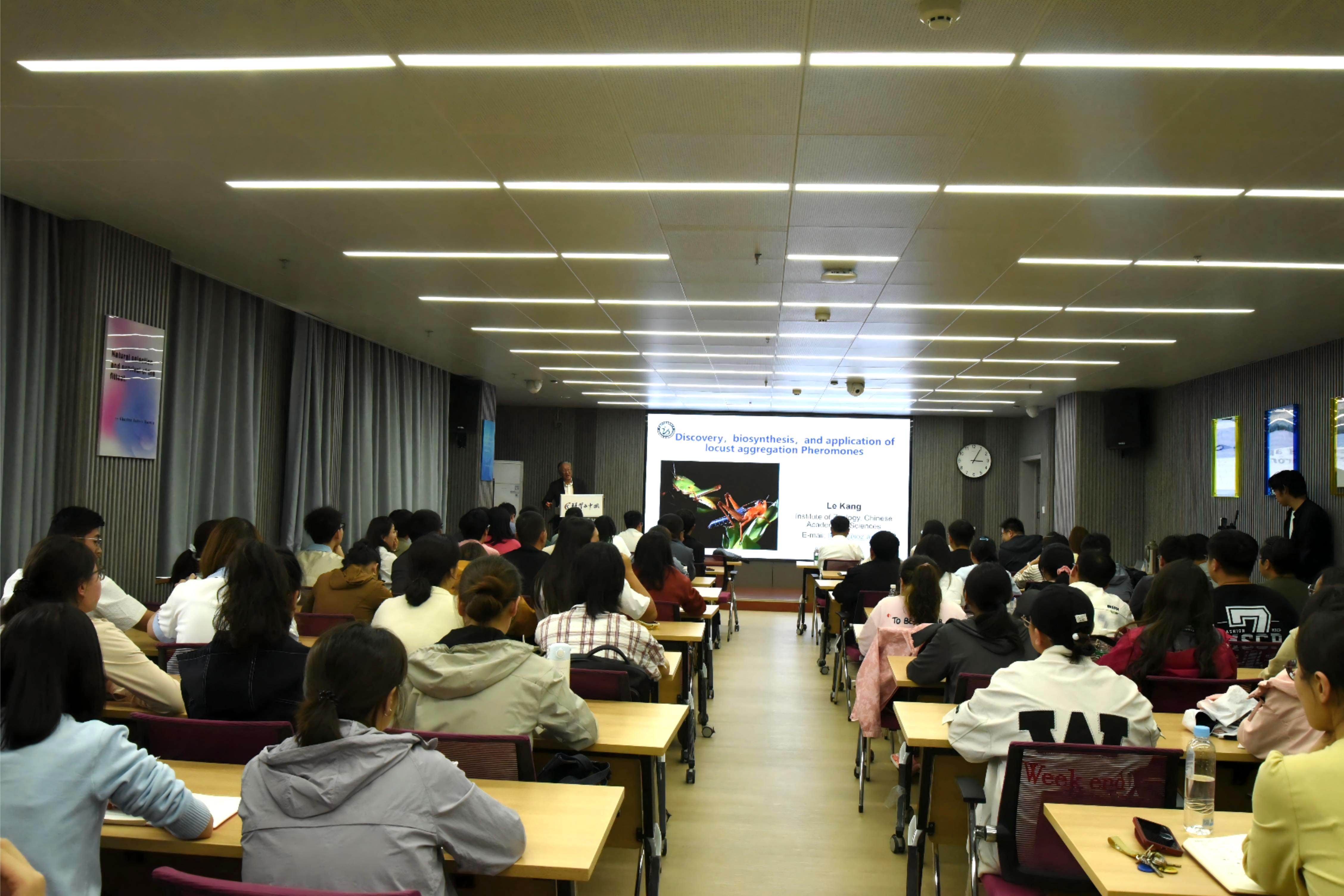 講座環(huán)節(jié),康樂院士詳細闡述了蝗蟲群聚信息素的發(fā)現(xiàn)研究過程和注意細節(jié),從基礎理論到應用實踐,層層剖析,向大家講解了蝗蟲群聚信息素的發(fā)現(xiàn)、生物合成和應用,生動的講解了蝗蟲群聚信息素4-乙烯基苯甲醚(4VA)在蝗蟲體內(nèi)產(chǎn)生的過程,以及蝗蟲利用植物中常見的氨基酸來合成自己特異的群聚信息素。基于對4VA生物合成途徑的解析,康樂院士研究團隊設計出一種小分子抑制劑,能夠精準調(diào)控4VA的合成和釋放,從而有效干預蝗蟲的群聚行為。為蝗災“綠色防控”提供了全新技術方案,為開發(fā)與利用昆蟲信息素實現(xiàn)精準調(diào)控害蟲行為提供了新的思路,推動了害蟲綠色可持續(xù)防控的發(fā)展。