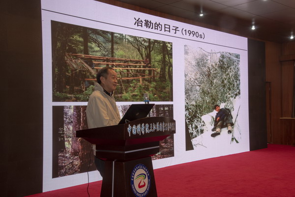 魏輔文院士以他的學(xué)術(shù)生涯為主線,講述了其自20世紀(jì)80年代開始從事大熊貓的研究工作,從最初的大熊貓野外調(diào)查、觀察,到率先將種群基因組學(xué)、宏基因組學(xué)、比較基因組學(xué)等新技術(shù)應(yīng)用到大熊貓研究中,闡明了大熊貓的種群歷史、瀕危過程及演化潛力,揭示了大熊貓?jiān)谑承赞D(zhuǎn)換和特化歷程中如何在形態(tài)、行為、生理、遺傳和腸道微生物等方面產(chǎn)生適應(yīng)性演化的規(guī)律;闡明了棲息地破碎化導(dǎo)致大熊貓孤立小種群崩潰的機(jī)制,推動了國家大熊貓放歸和棲息地廊道建設(shè)工程的實(shí)施。魏輔文首次提出“保護(hù)演化生物學(xué)”和“保護(hù)宏基因組學(xué)”新分支學(xué)科,并介紹了穩(wěn)定同位素分析技術(shù)和營養(yǎng)幾何模型分析等新技術(shù)和新方法。魏院士結(jié)合自己30多年在保護(hù)生物學(xué)領(lǐng)域的經(jīng)歷,鼓勵大家在科學(xué)道路上堅(jiān)持思考,不斷探索,勇于創(chuàng)新。此次報(bào)告大大開拓了與會人員的學(xué)術(shù)視野,鼓舞了廣大科技人員的科研熱情。