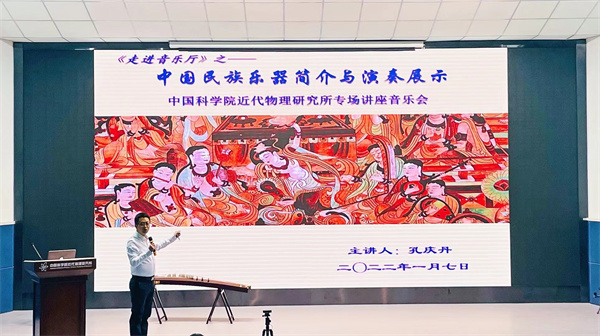 本次論壇以《<走進(jìn)音樂(lè)廳>之中科院近代物理所新年民樂(lè)專(zhuān)場(chǎng)講座》為主題,報(bào)告人孔慶丹教授來(lái)自于西北師范大學(xué)音樂(lè)學(xué)院,報(bào)告人詳細(xì)介紹了包括笛、嗩吶、笙、二胡、琵琶、柳琴、阮、箏等在內(nèi)的多種傳統(tǒng)民間樂(lè)器,同時(shí)配以現(xiàn)場(chǎng)演奏的方式,使得大家認(rèn)識(shí)欣賞樂(lè)器的同時(shí)也深入了解了各類(lèi)民樂(lè)的表現(xiàn)形式以及音樂(lè)廳文化,對(duì)民樂(lè)有了更加立體、直觀的認(rèn)識(shí)。報(bào)告結(jié)束,大家就如何提高個(gè)人藝術(shù)修養(yǎng)以及對(duì)青少年的音樂(lè)啟蒙教育等問(wèn)題與主講人進(jìn)行了熱烈的探討和交流。