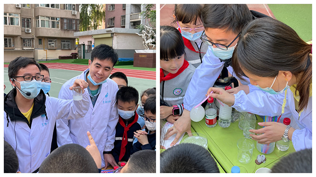 來自羰基合成與選擇氧化國家重點實驗室、固體潤滑國家重點實驗室、中科院西北特色植物資源化學重點實驗室和環(huán)境材料與生態(tài)化學研究發(fā)展中心的8名職工和研究生,開展了“CO2‘看得見’”系列互動實驗、“靜電‘吸引’‘懸浮’及釋放”實驗、“美麗的彩虹”系列實驗、“大象牙膏”實驗等4組實驗。他們用通俗易懂的語言介紹實驗用品和注意事項,結(jié)合生活中的現(xiàn)象講解實驗原理,認真仔細展示實驗步驟,現(xiàn)場答疑解惑,引導學生們自己動手去感受科學實驗的樂趣。
