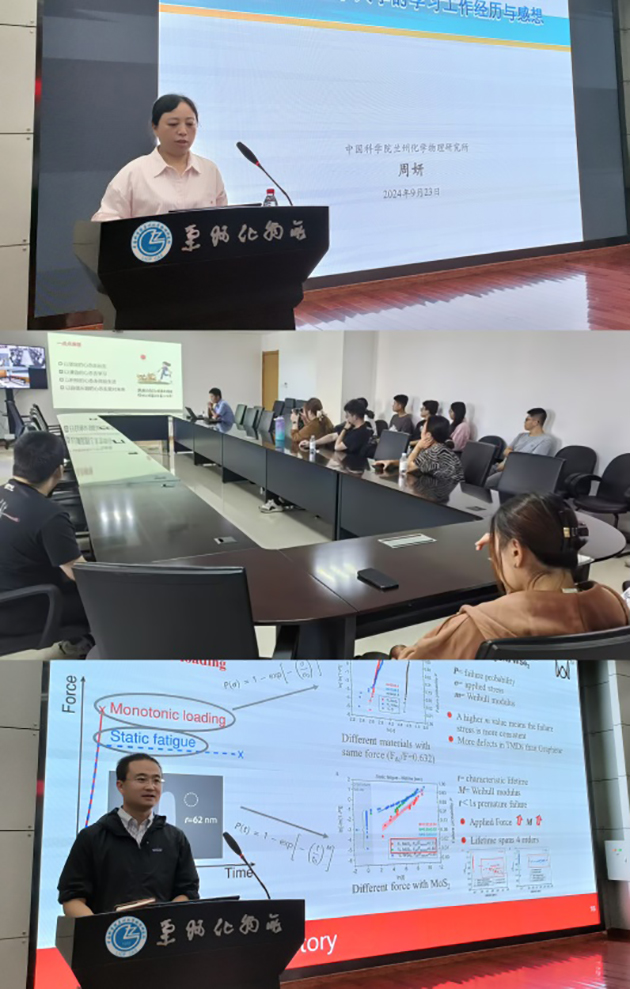 2019年度中國(guó)科學(xué)院公派留學(xué)訪學(xué)項(xiàng)目獲得者、蘭州潤(rùn)滑材料與技術(shù)創(chuàng)新中心周妍博士和王超博士,2022年度科技部青年科技人才中長(zhǎng)期出國(guó)(境)培訓(xùn)項(xiàng)目獲批人、潤(rùn)滑材料重點(diǎn)實(shí)驗(yàn)室嚴(yán)云峰博士分別圍繞摩擦誘導(dǎo)界面結(jié)構(gòu)對(duì)稱破缺機(jī)理研究,熒光成像原位研究潤(rùn)滑油在多孔含油材料及摩擦界面處的流動(dòng)與分布機(jī)制研究,單層MXene的制備、破壞力和疲勞的研究及取得的成果進(jìn)行了報(bào)告,介紹了國(guó)外學(xué)校、合作者及所在團(tuán)隊(duì)的概況,分享了國(guó)外實(shí)驗(yàn)室和團(tuán)隊(duì)的先進(jìn)管理經(jīng)驗(yàn)、良好的工作習(xí)慣、外方機(jī)構(gòu)選擇、項(xiàng)目申報(bào)中的注意事項(xiàng)以及在外期間面對(duì)的困難挑戰(zhàn)和學(xué)習(xí)生活趣事等。
