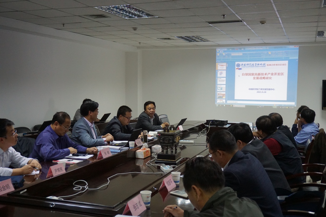 9月28日,“白銀國家高新技術開發(fā)區(qū)創(chuàng)新發(fā)展戰(zhàn)略研究”項目啟動會在中國科學院蘭州文獻情報中心召開,來自甘肅省政府研究室、中科院蘭州分院、中科院近代物理研究所、中科院蘭州化學物理研究所、西北師范大學、白銀國家高新技術開發(fā)區(qū)等單位的十位專家對項目研究方案進行了深入咨詢。會議由蘭州文獻情報中心主任張志強研究員主持,中國科學院蘭州分院副院長楊青春、院長助理張健以及院地科技合作處負責人等參加了會議。